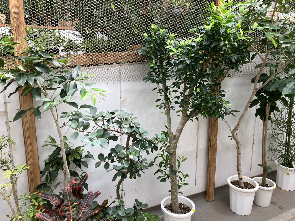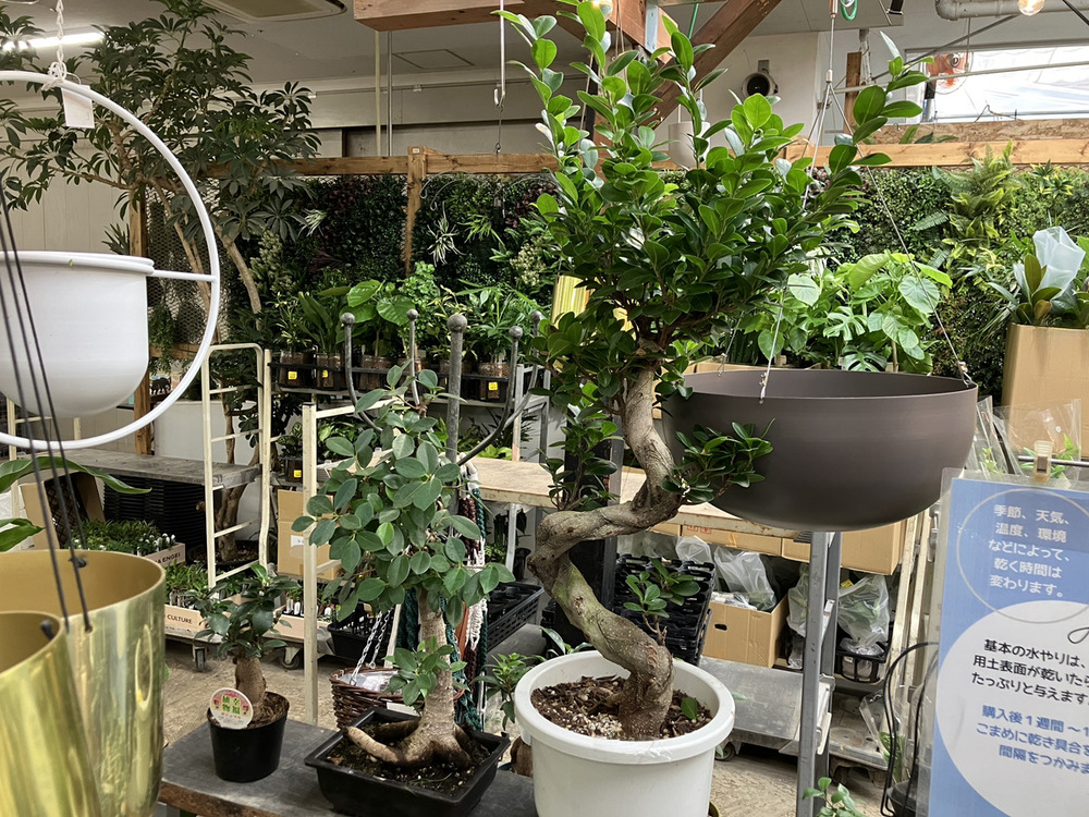 ▲新芽が明るい身の丈くらいのガジュマルと曲がりのパンダガジュマル。