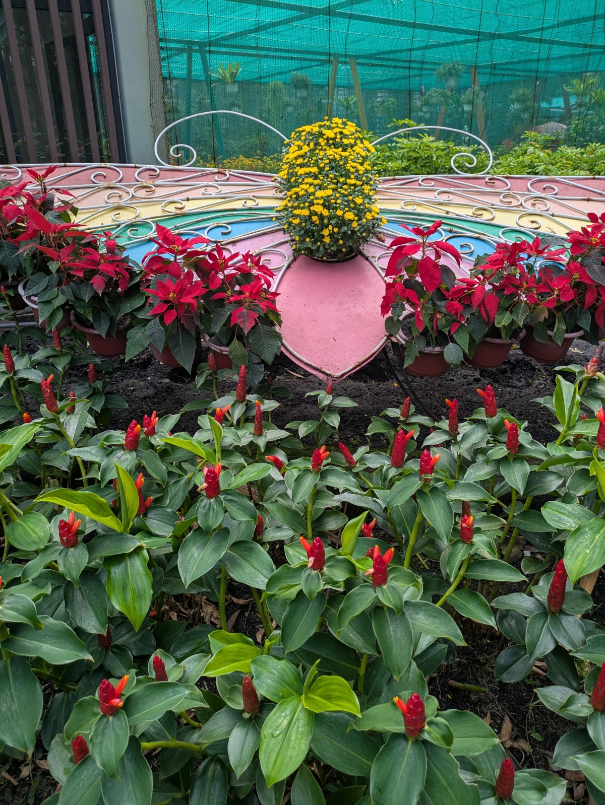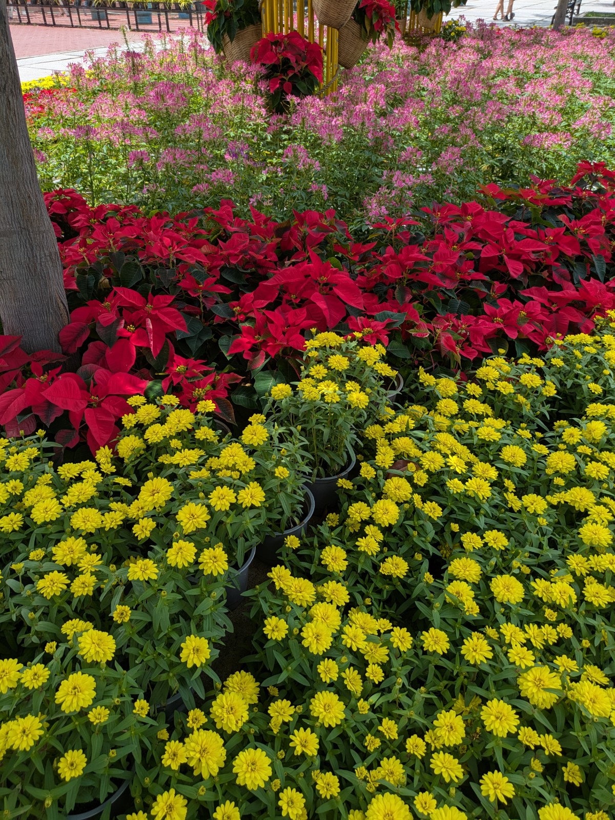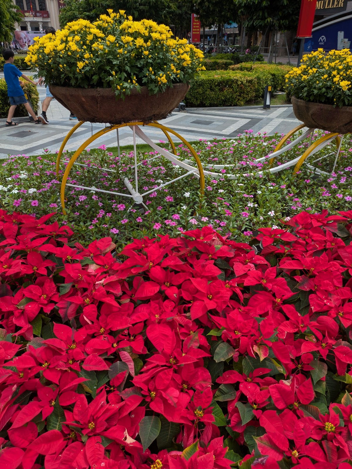 皆様、手前のこの赤い花、お分かりになりますか。そう、ポインセチアです。花と申しましたが正確には笣と呼ばれる葉が変化したものです。ポインセチアはメキシコ原産(熱帯地域ではないですが)で温暖な気候が好きですからホーチミンで地植えができるのは不思議はないのですが、どうしてもクリスマスのイメージしか無いこの植物をこの時期に使うのは感覚が違って面白いなと思いました。そして実にいたるところにあるのです。しかも上の画像では菊ですが、他にもジニアなどの鮮やかな黄色の花と組み合わされていることが多かったです。