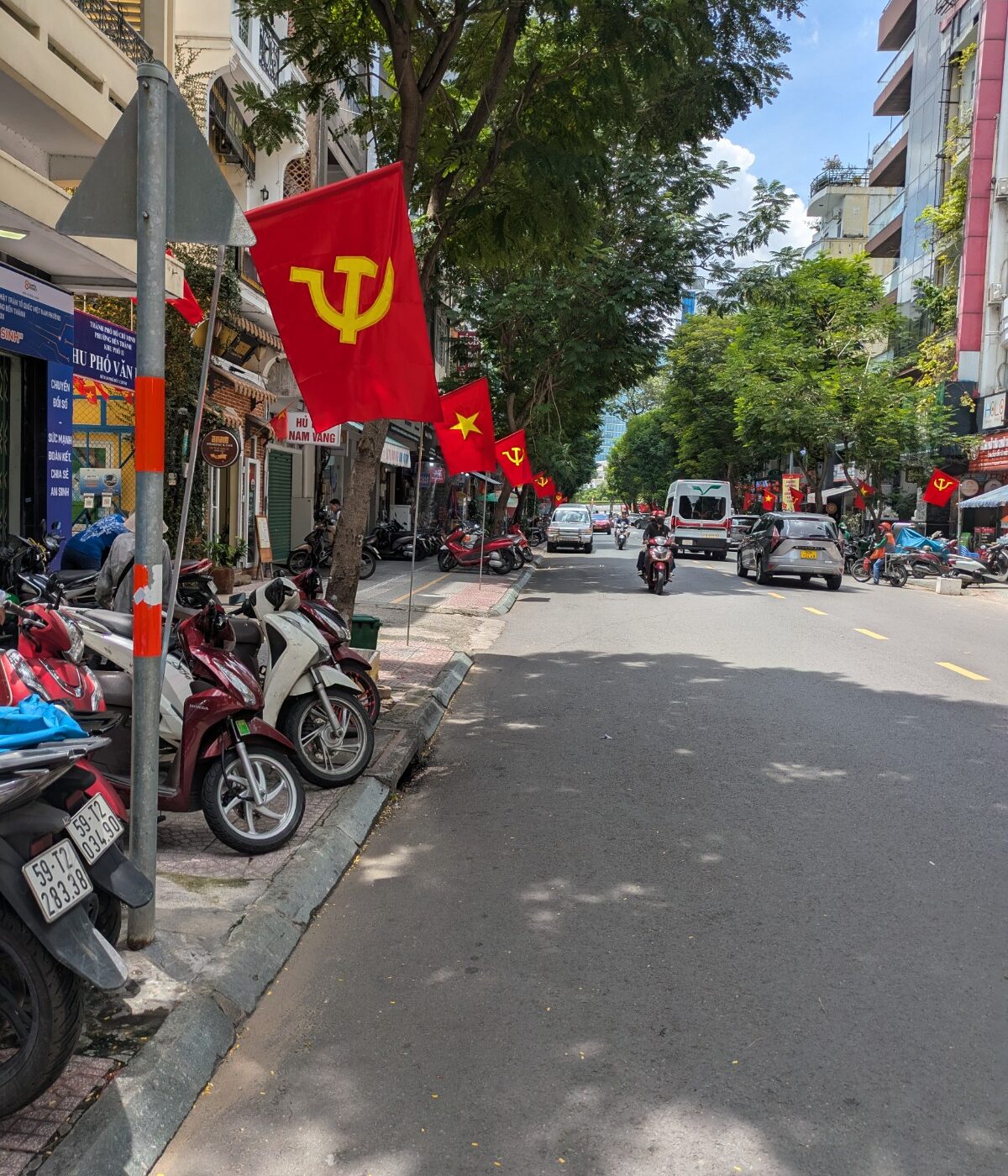 ホーチミンも大商業都市ですからクリスマスの装飾も街中で盛大にされることでしょうが、8月の終わりにこんなにも当たり前のようにポインセチアを使うのはなぜだろうと考えましたが、黄色い花とよく組み合わされるということは国旗のイメージでしょうか… 社会主義のテーマカラーもまずは赤ですしそこに黄色の星や鎌、ハンマーなどのマークがありますものね。そうやって思うとポインセチアの花(笣)の形も社会主義の星に見えてきませんか。