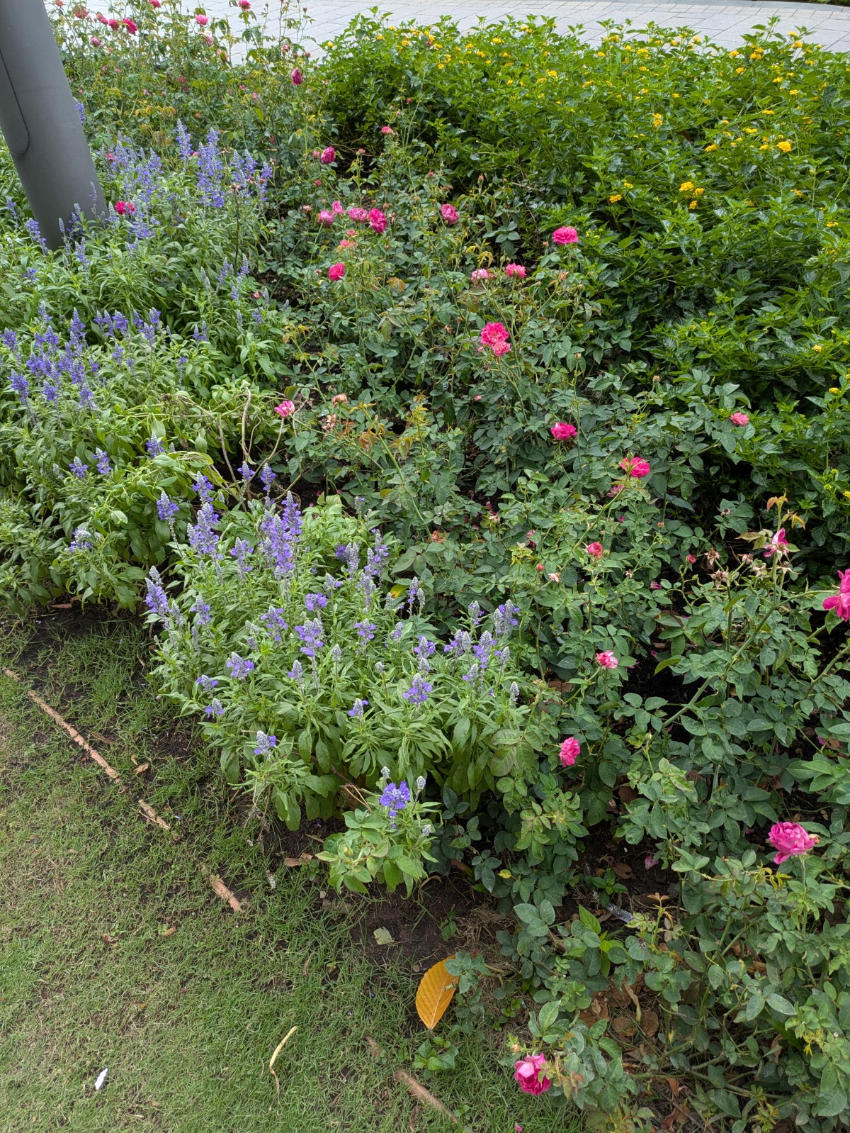 ブルーサルビア。バックの黄色い花はランタナ。ミニバラと一緒に植えられていました。冬のない地域でバラを育てるとどうなるのでしょう…