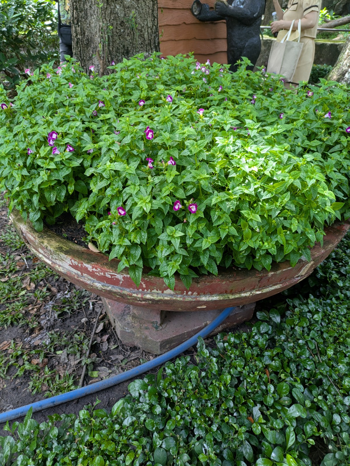 日本でも人気の草花でよく目にした植物をあげると、ニチニチソウ、ジニア、アンゲロニア、センニチコウ、アメリカンブルー、クレオメ、キバナコスモス、トレニアといったところでしょうか。意外にも同じものを使うのだなと親しみが湧きました。ただし日本と違うところは、まず街路樹や公園の木々が全て馴染のない熱帯の樹木ですし、こちらだとツワブキやオカメヅタ、アイビーなどの下草、グラウンドカバー類がいわゆる観葉植物です。当店でも大切に売っているアグラオネマやシンゴニューム、セローム、ゴッドセフィアナ、ザミオカルカス、ディフェンバキア、フィロデンドロンなどが無造作に直接植えられています。カジュアルな一年草の草花と観葉植物が同列に扱われている様子は、日本人からすると不思議な感覚がいたしました。そしてそこにヘリコニアやジンジャーなどのいかにも熱帯の花をつける植物と蓮などがよく組み合わされてました。