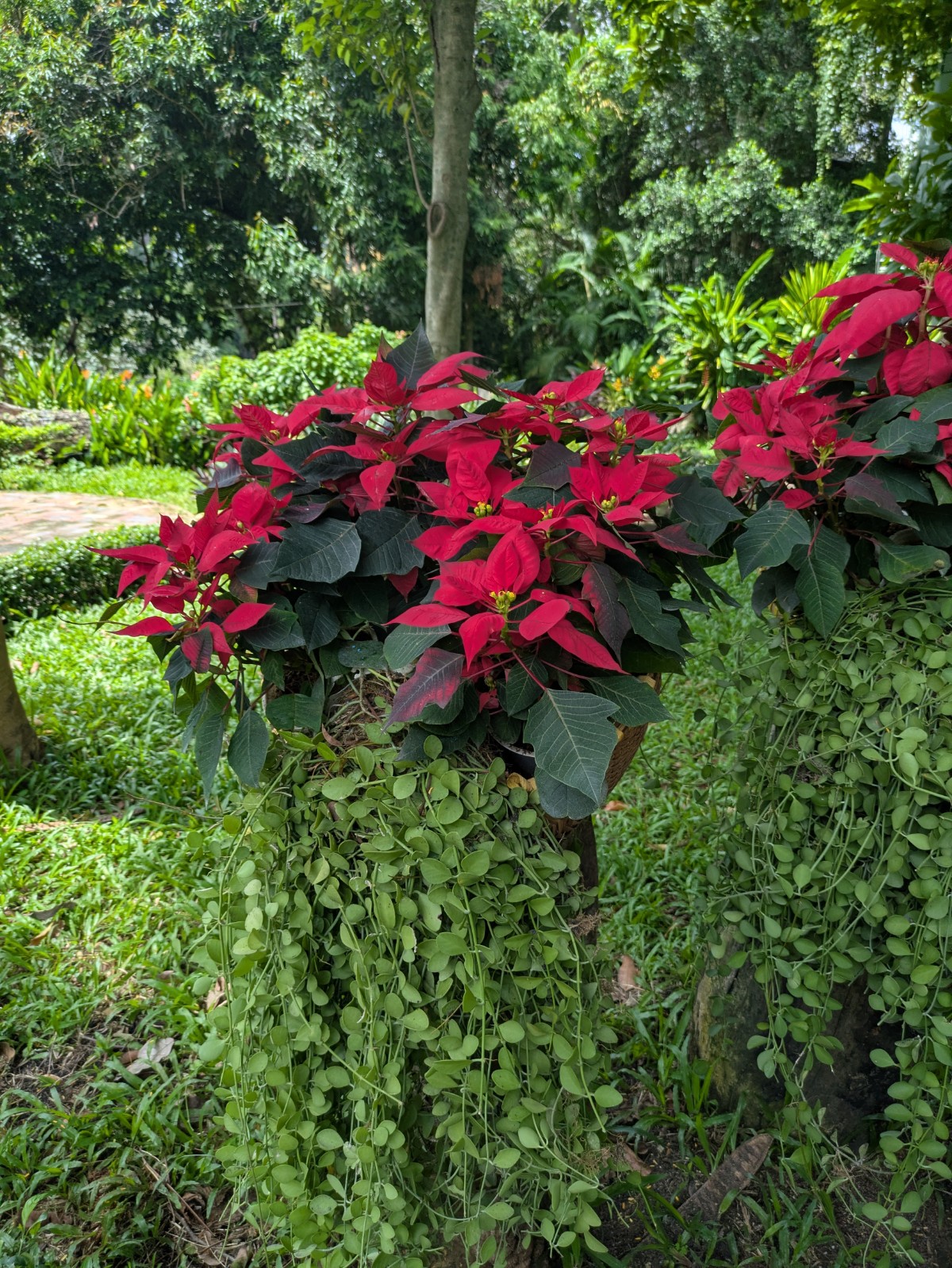 ポインセチアの単独植え。足元には観葉植物のディスキディア。