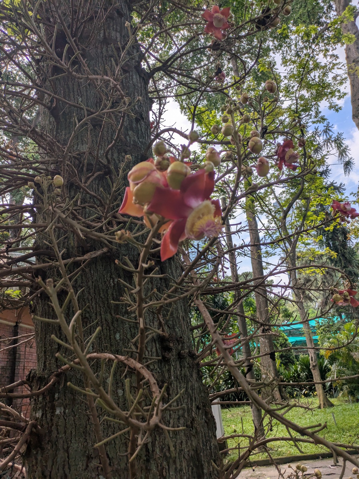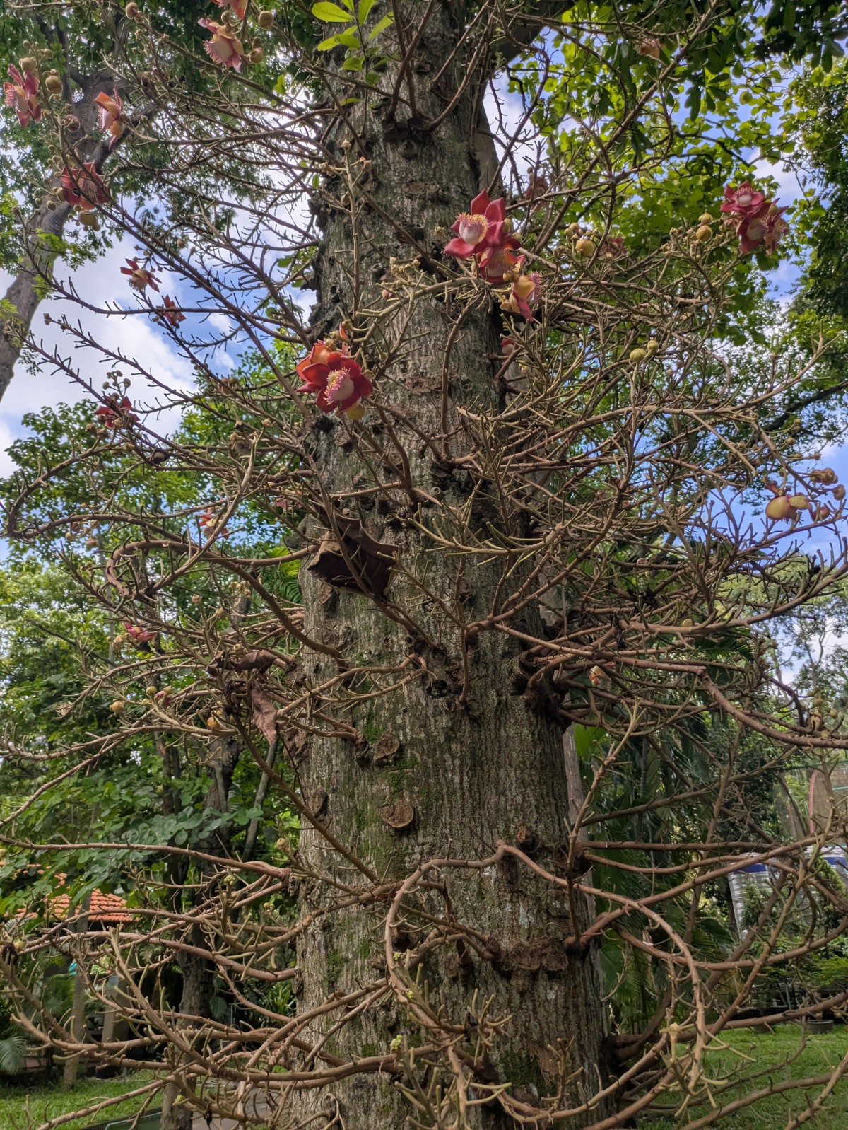 この木はアジア最古と言われるサイゴン動植物園を散策していた時に、突如として現れ、そのまさに異形な姿に度肝を抜かれました。非常に樹高の高い木で空に近い所に葉を茂らせており、地上に近い所、ちょうど私の頭上のあたりに太い幹から直接奇怪な花をつけていました。なんとも形容のしがたいインパクトのある花形、人の常識をあざ笑うかのような花のつけかたに名前を知りたいと思ったのですが、プレートも説明の看板等もなにも無く、ずっと気になっていたところ、帰国してから調べていましたらわかりました。