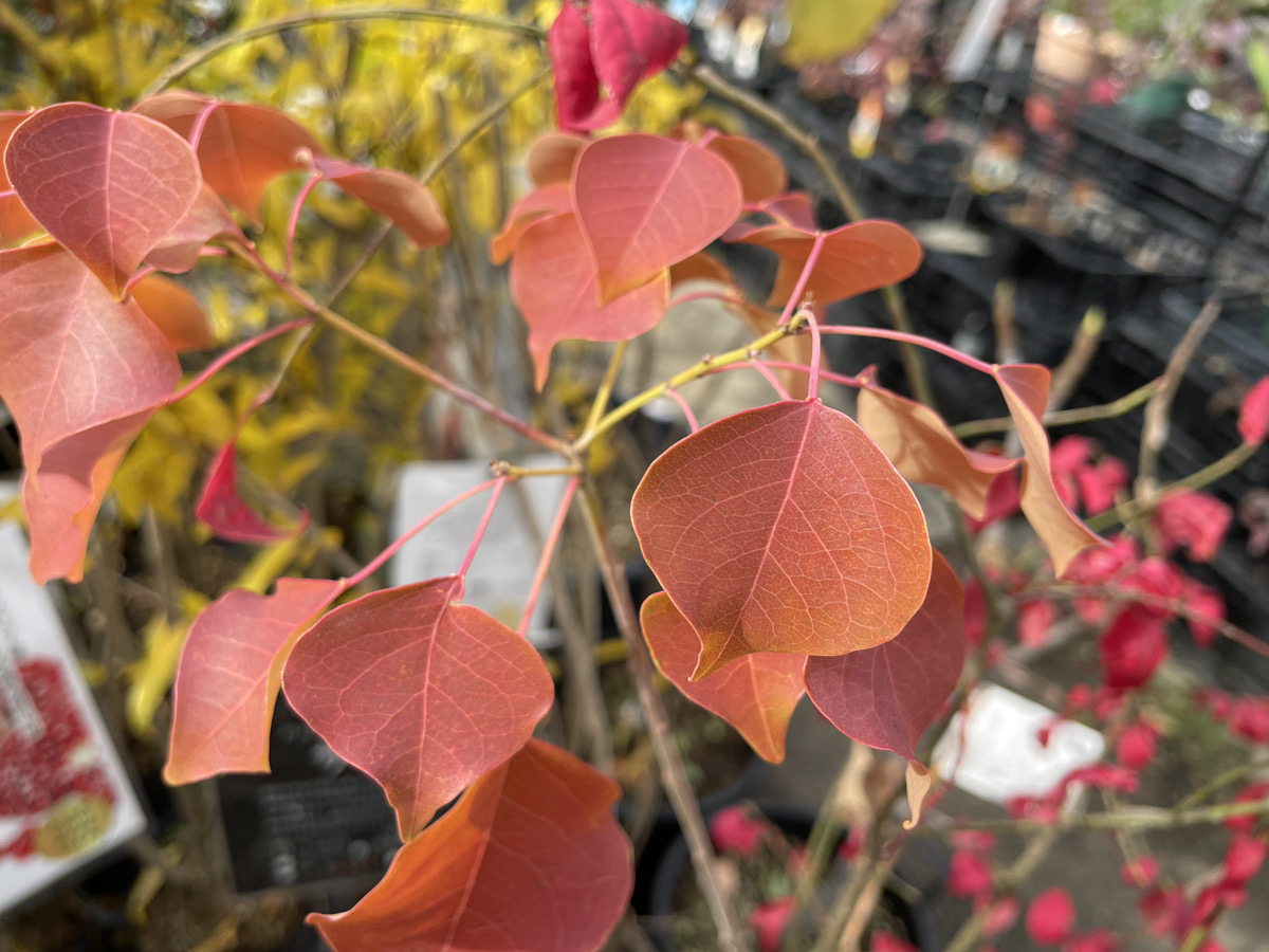 ▲ミメティス クラッカージャックレッド 色づく葉にもふもふとした独特の花…この時期ならではの仕上がりです