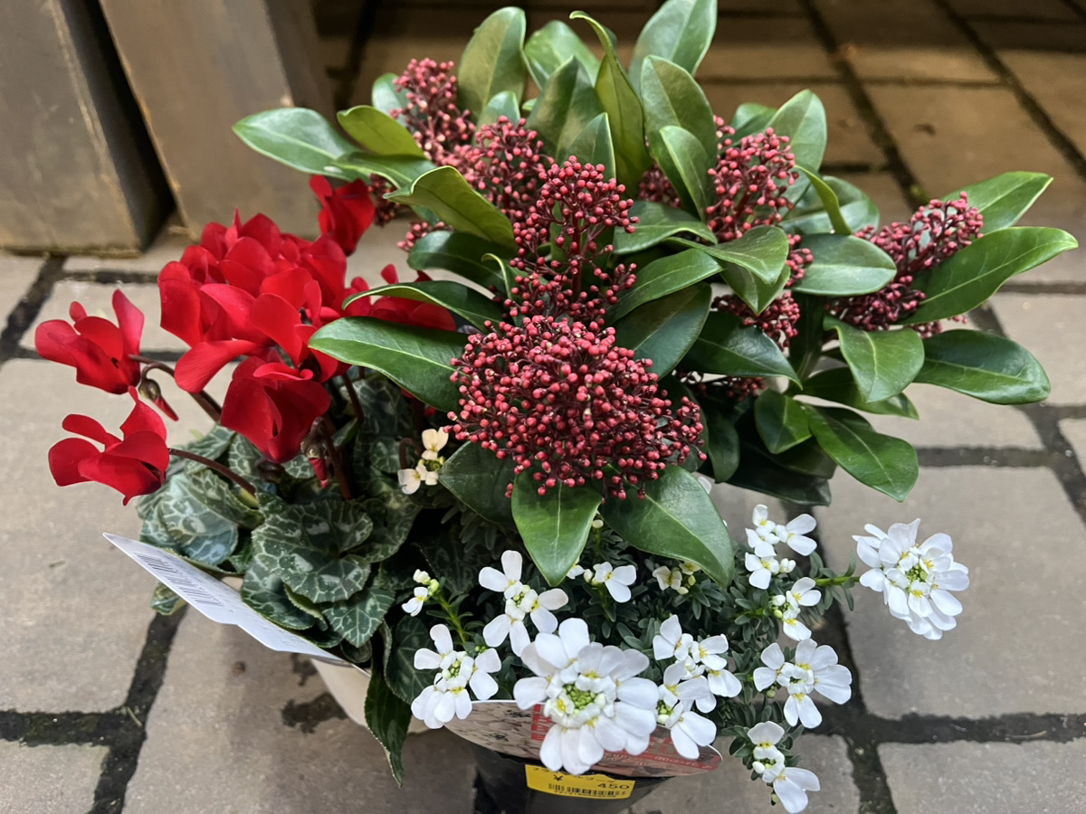 ●次に「季節感を重視する」ということです。(スキミヤ/イベリス/ガーデンシクラメン赤)クリスマスが近いということもあり、冬の色と言えば赤を連想される方も多いのではないでしょうか。インパクト重視する場合は赤いシクラメンやポインセチアを。少し大人に仕上げたい場合にはスキミヤなどがおすすめです。また、色相環のどこにも属さない「白」はメインの花を強調させるとともに全体のバランスを整え、モダンで清楚な印象を与えてくれる役割を持ちます。