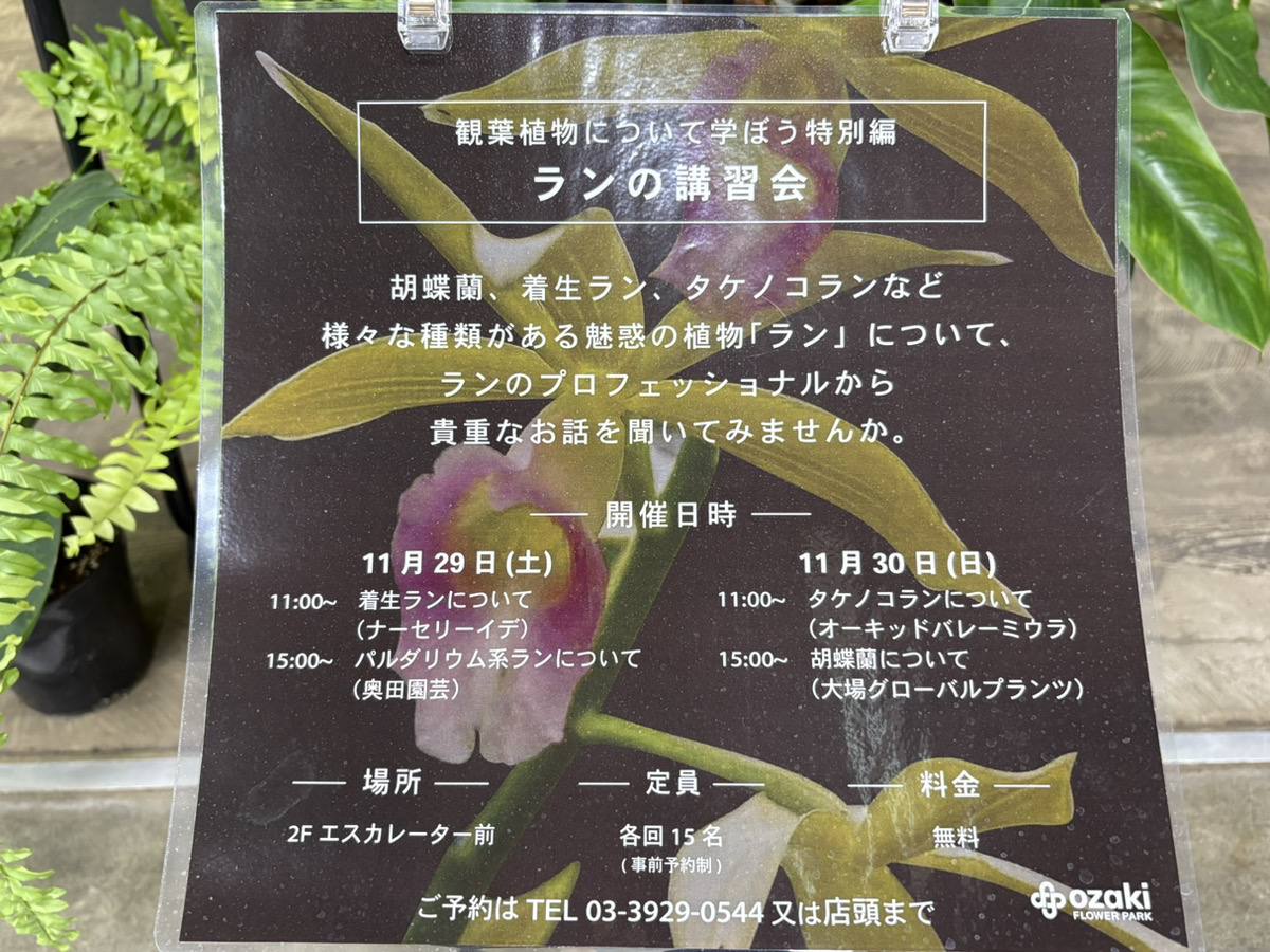 「OZAKI ORCHID FAIR」の開催日は11/29(土)、11/30(日)です。二日ともに、ランの講習会もありますのでぜひ参加してみてください!