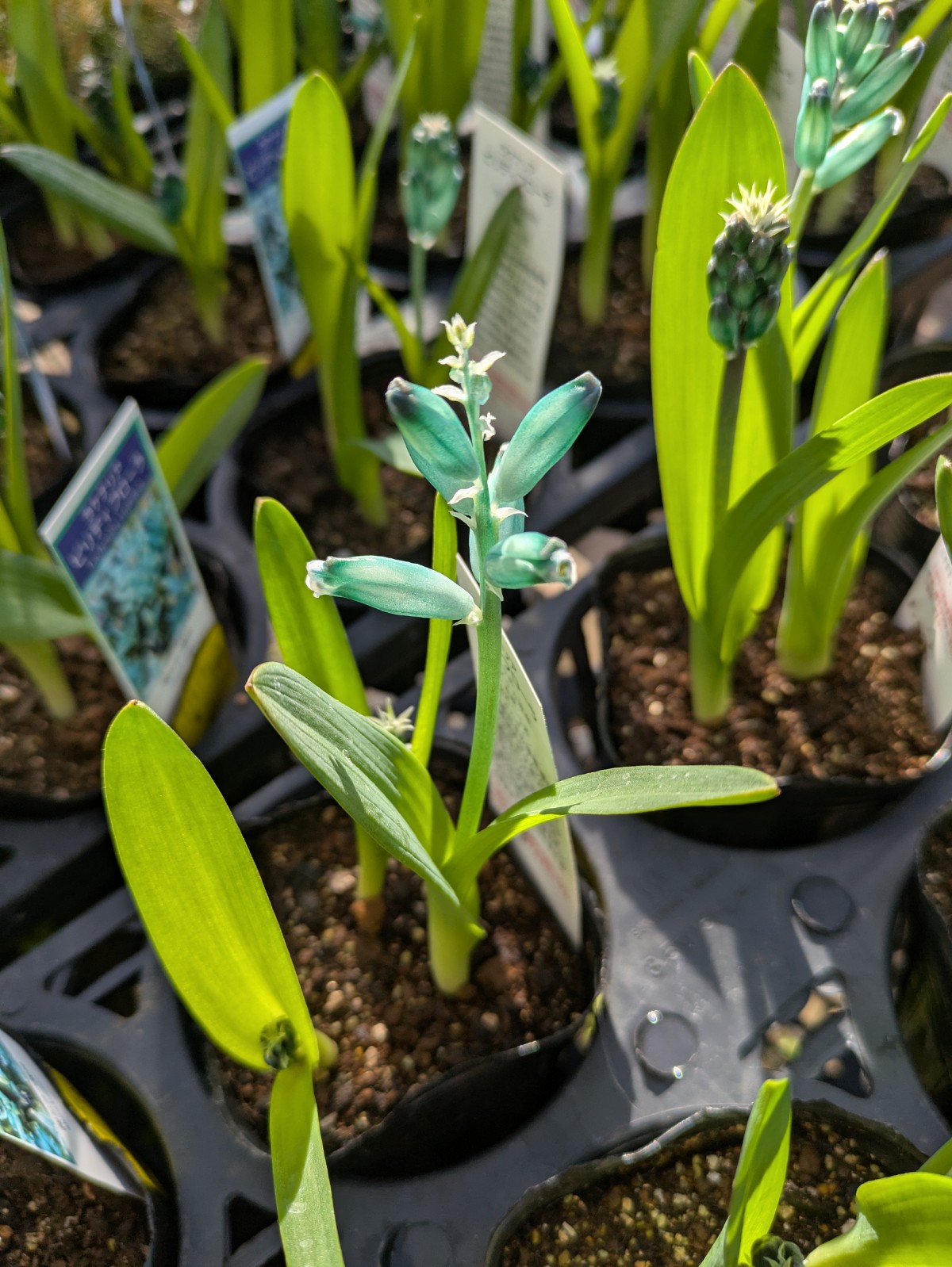 ラケナリアは南アフリカに多くの種が分布する球根植物で、スイスの植物学者のラシュナル氏にちなんで命名された学名だそうです。こちらの種ヴィリディフローラは「緑色の花をつける」といった意味の種小名でその名の通り神秘的な青緑色の花を咲かせます。ラテン語で「緑の」を意味する「viridis」と「花」を意味する「flora」に由来し、けっこう様々な植物で見かける学名です。小学校の時に使った絵具の中にもヴィリジャン(viridian)という青みがかった緑色がありましたよね?子供心に変な名前だなと思っていましたが...