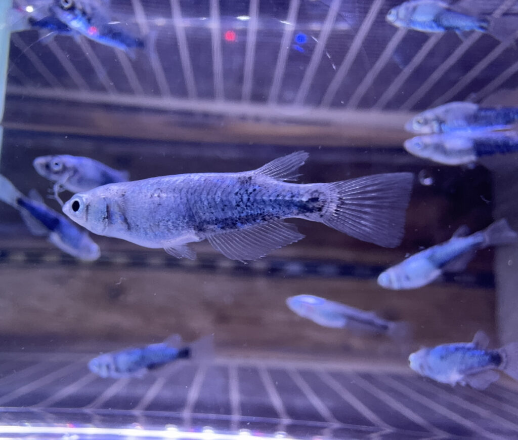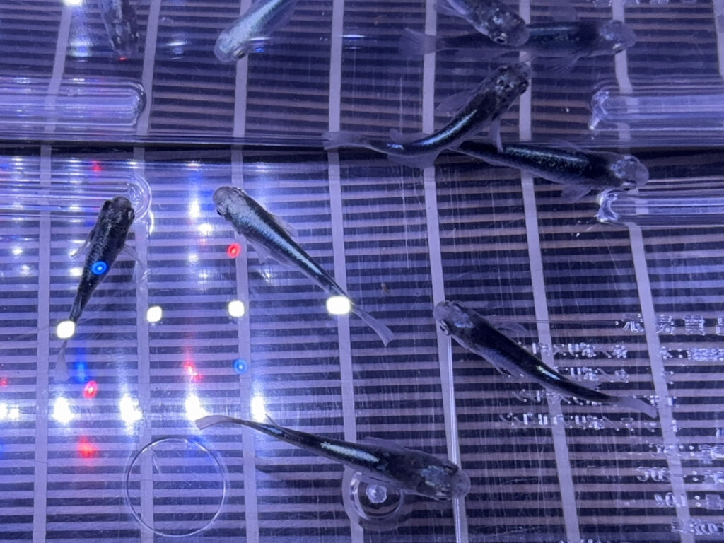 黒い体色、青白い光が綺麗に輝く品種です。“サバの極みメダカ”と“黒百式”の掛け合わせにより産出されました。