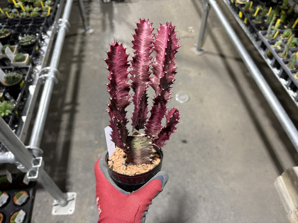 ▲紅彩雲閣 こちらは綺麗な赤が映えるユーフォルビア。こちらもサボテンの様な姿となっています。