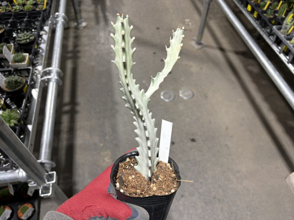 ▲ホワイトゴースト 白に薄く緑を溶かしたような色が特徴のユーフォルビアです。こちらはサボテンに似ているようなタイプの姿をしています。