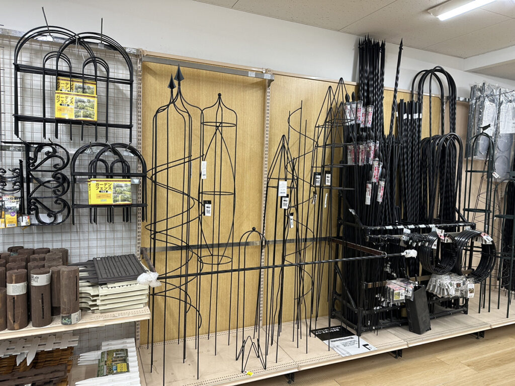 つる性植物のクレマチスには必要になってくるオベリスクなどの資材もそろえております。
