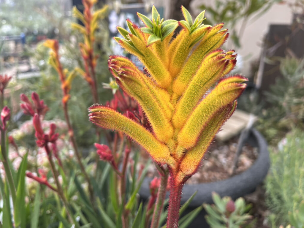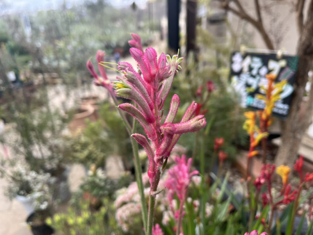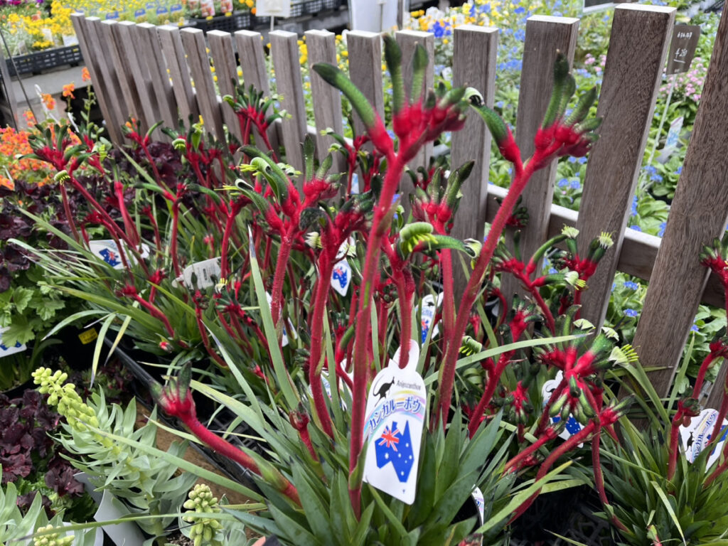 ▲カンガルーポー レッド&グリーン オーストラリア原産の多年で、産毛に覆われた鮮やかな花を咲かせます。カンガルーの前足に似ていることからその名が付きましたが、この品種に関してはまるで恐竜の様ですね。