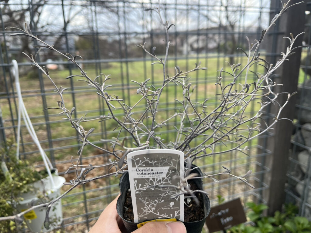 ▲コロキア コトネアスター ニュージーランド原産の常緑低木。ジグザグに曲がった灰色の幹とシルバーリーフがなんともシックな品種。たまに誤解されますが枯れていません!