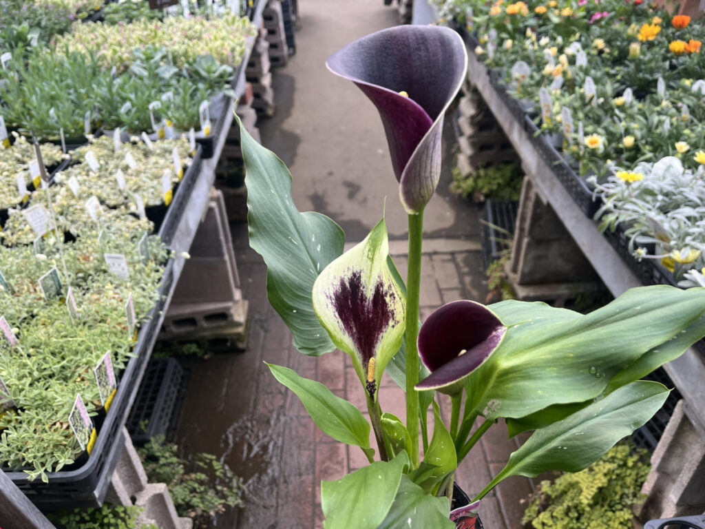▲カラー(黒) 南アフリカ原産のサトイモ科植物。ラッパ状の仏炎苞が特徴、実際の花は中心の細い部分になります。球根植物で毎年咲かせてくれます。品種も様々でプレゼントにもおすすめです。