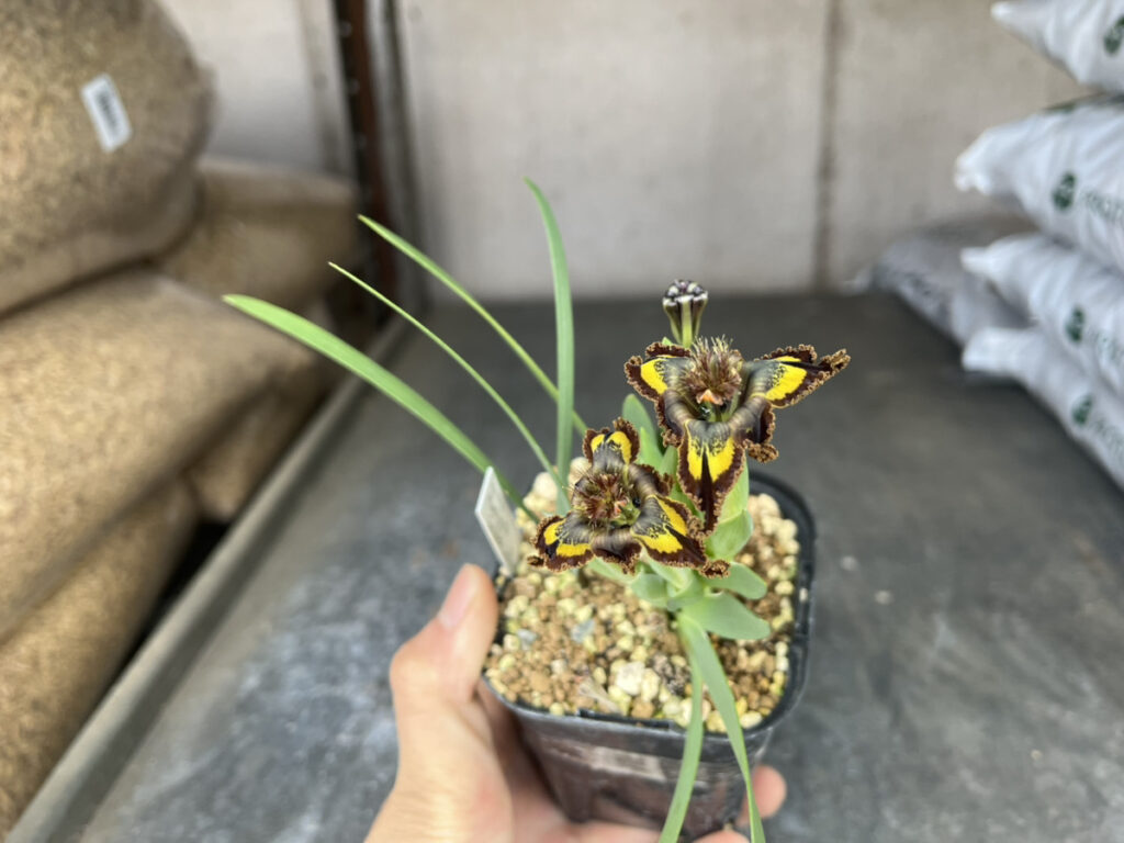 ▲フェラリア ゴールデンイエロー 南アフリカ原産、アヤメ科の球根植物。バルベット状の質感と黄色と茶色のコントラストが美しい花弁が特徴。