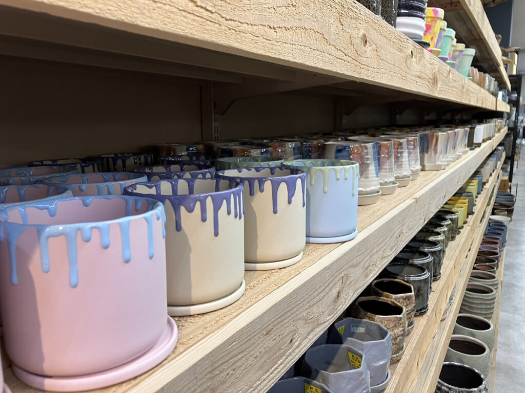 ▲デザイン性の高い陶器鉢。サイズやバリエーション多数。オイルを染み込ませたウッド素材やガラス、スチールなど何でもあり。