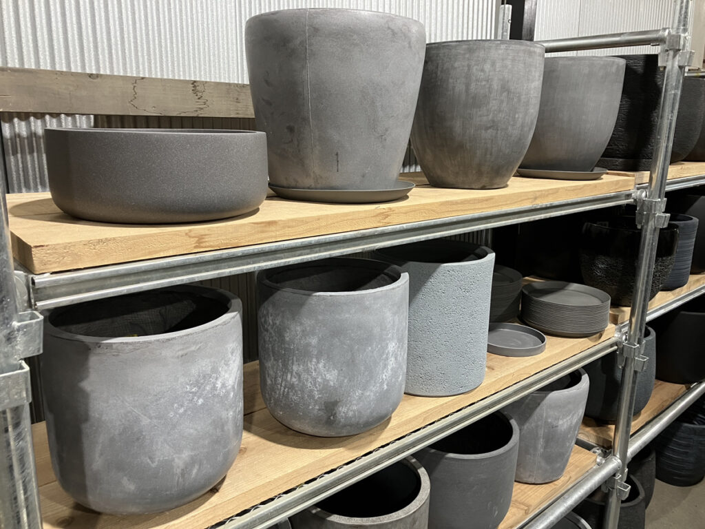 ▲陶器鉢より軽量なファイバークレーやFRP鉢。石のようですが片手で持てる軽さにびっくり。