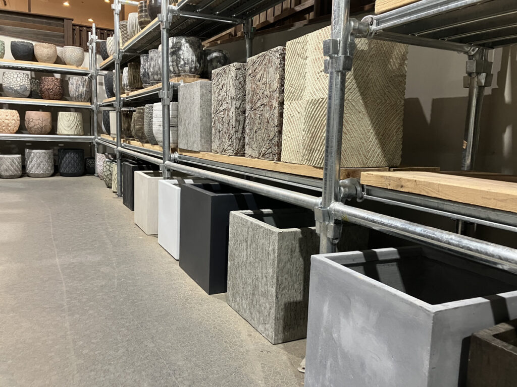▲底面積が広く安定感のあるFRPキューブ型ポット。並べて置いても形状の連続美もGood★