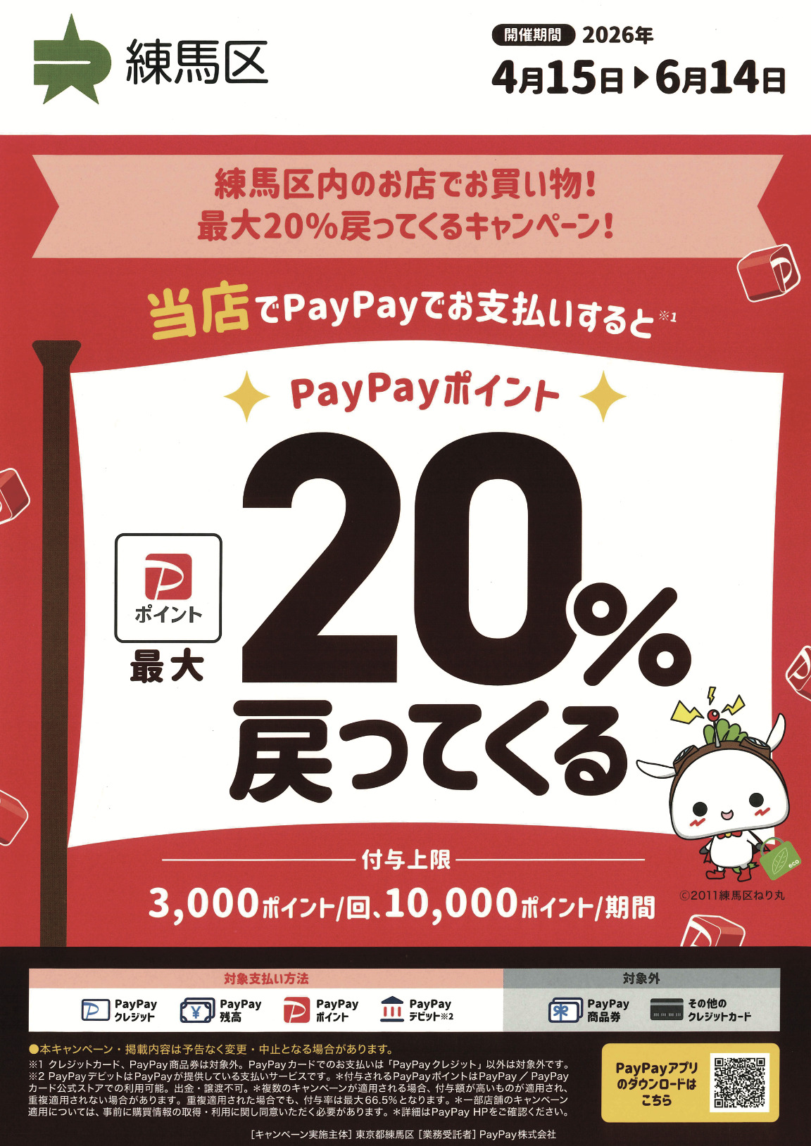 PayPay「練馬区内のお店でお買い物! 最大20%戻ってくるキャンペーン!」4/15から