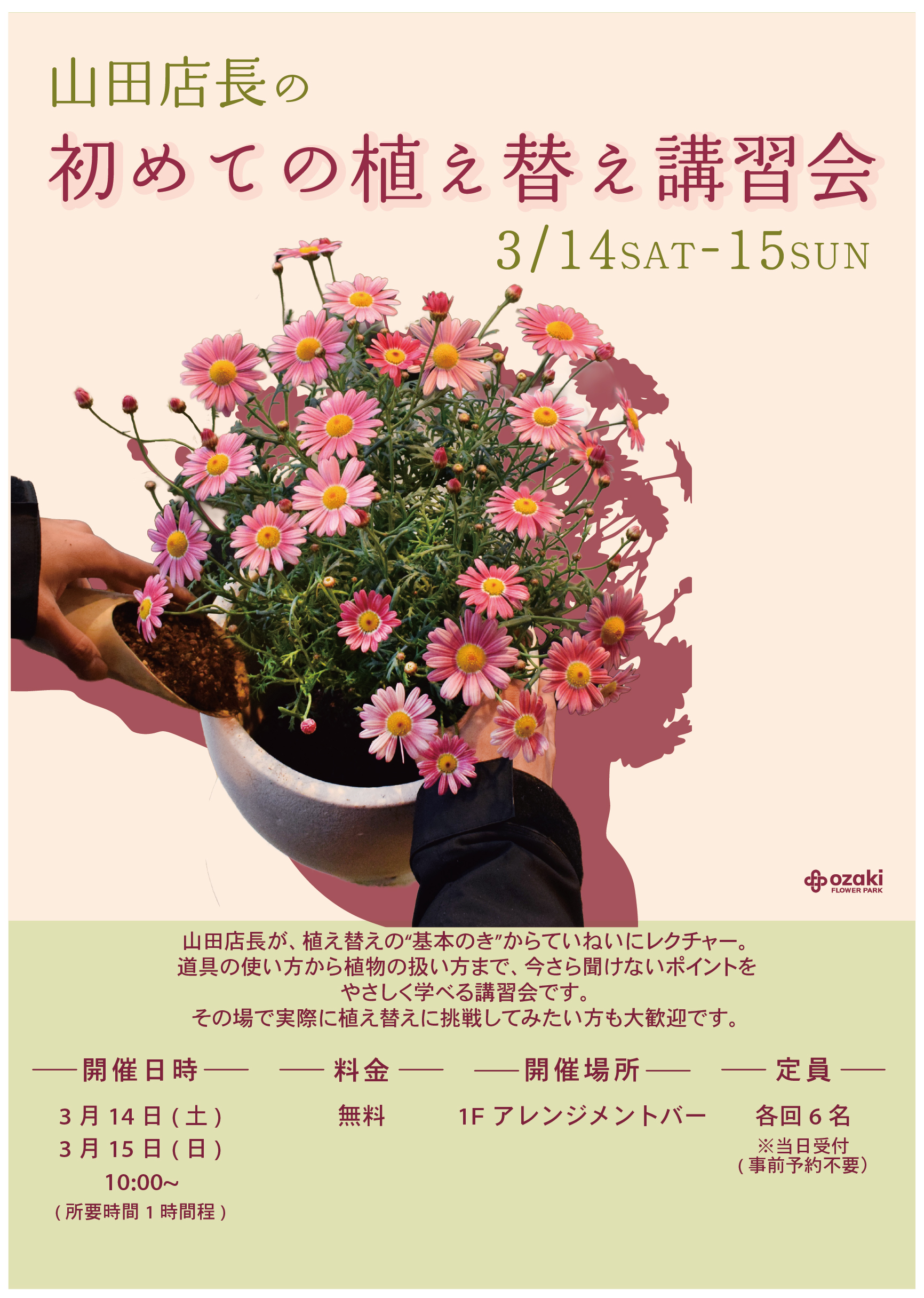 山田店長が、植え替えの”基本のき”からていねいにレクチャー。 道具の使い方から植物の扱い方まで、今さら聞けないポイントをやさしく学べる講習会です。 その場で実際に植え替えに挑戦してみたい方も大歓迎です。