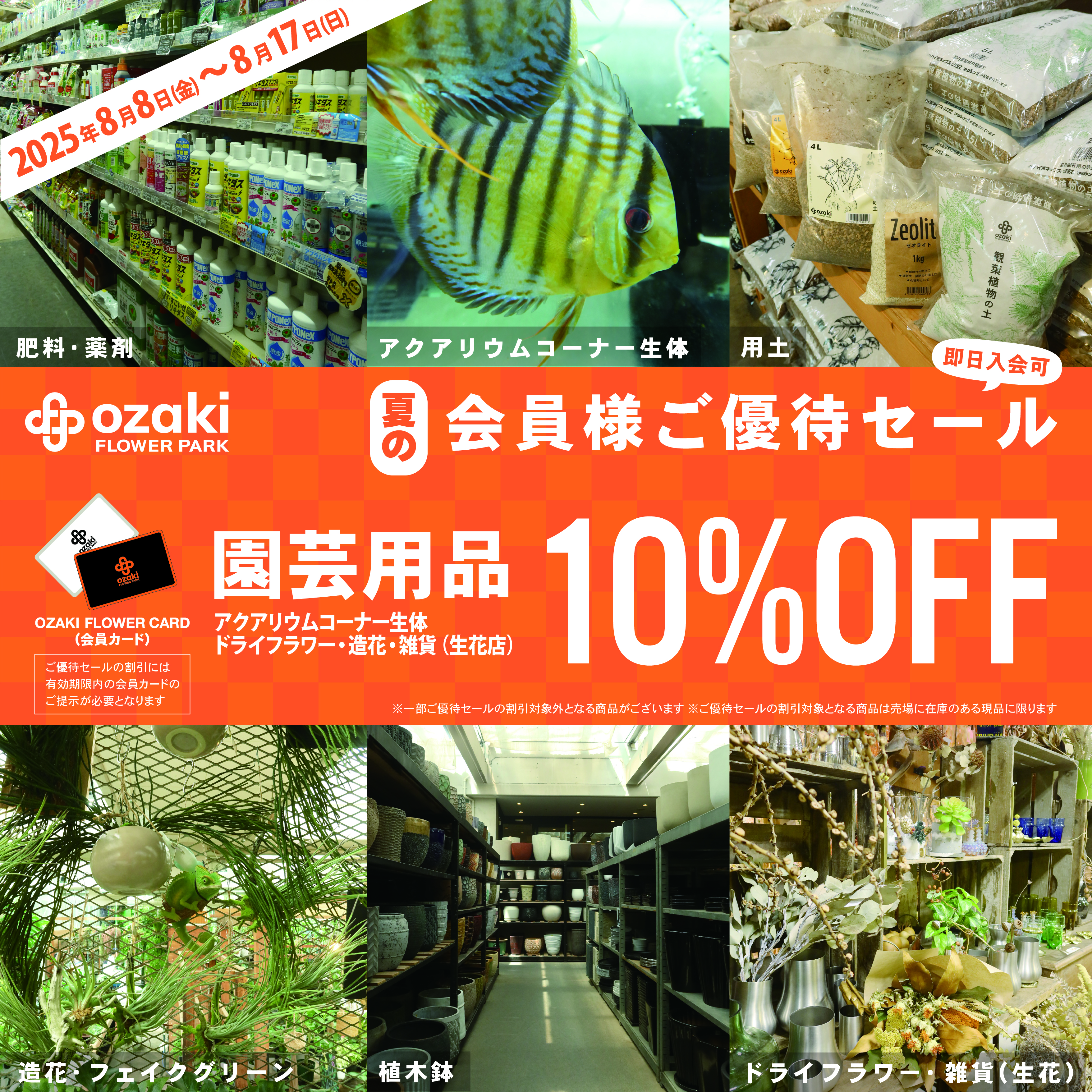 ※切花(生花店Rafflesia)、アクアリウムコーナー用品、文房具・おもちゃ、書籍、商品券、100円ショップSMILE、グリーンブリーズ、グロワーズカフェ、オンラインストア、手数料等はセール対象外となります