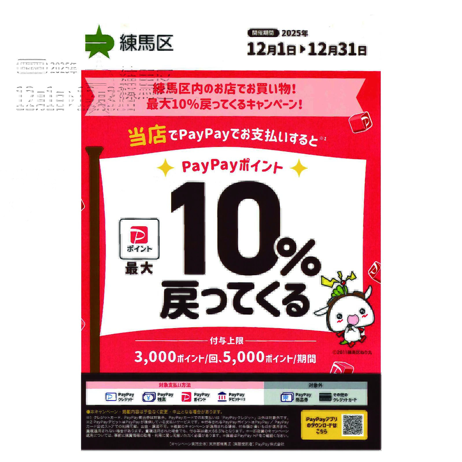 PayPay「練馬区内のお店でお買い物!最大10%戻ってくるキャンペーン!」12/1から